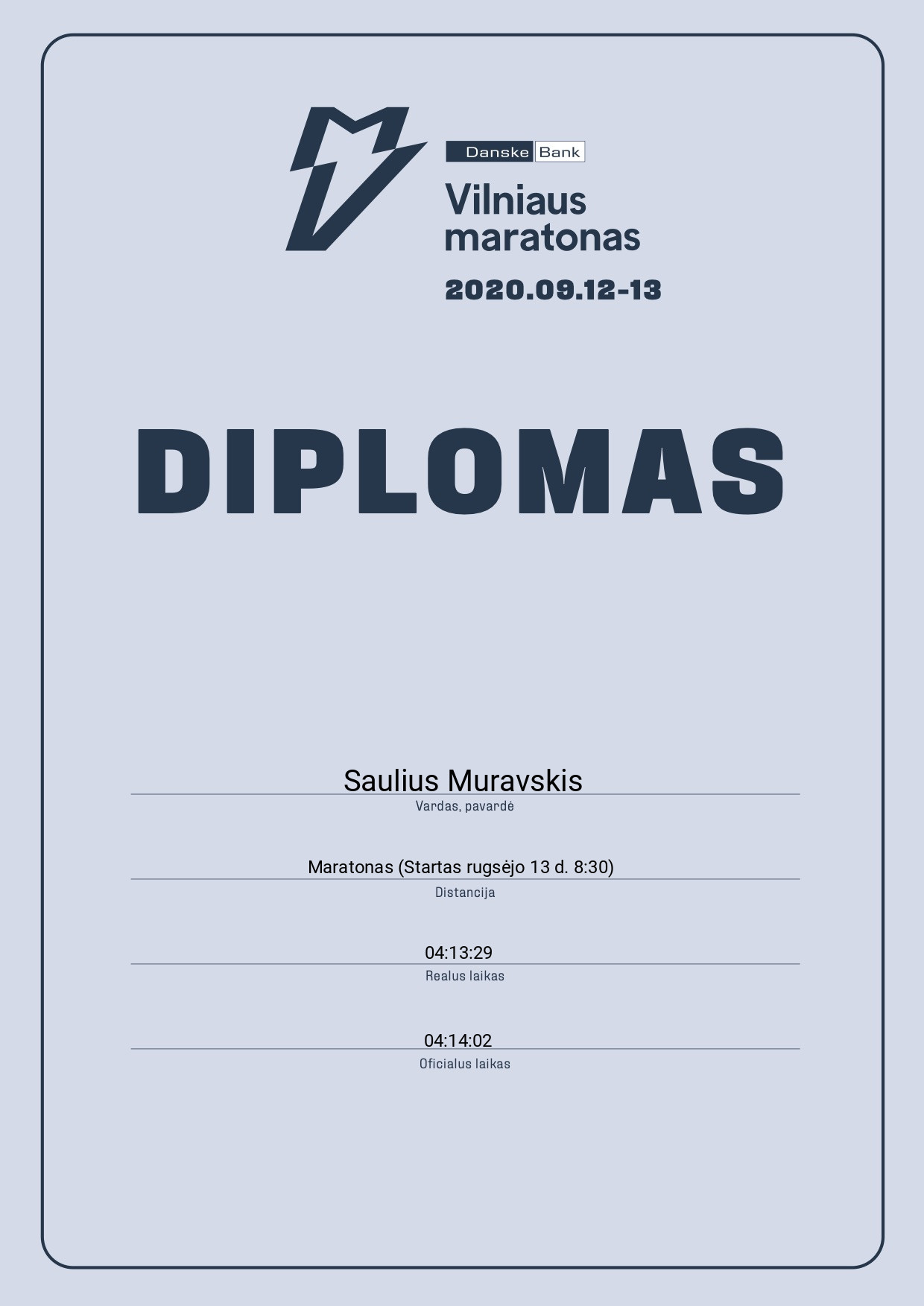 | 68 | Remigijus Savulionis | Origami runners | 825 | Lithuania | Maratonas (Startas rugsėjo 13 d. 8:30) | 03:17:55 | Diplomas |