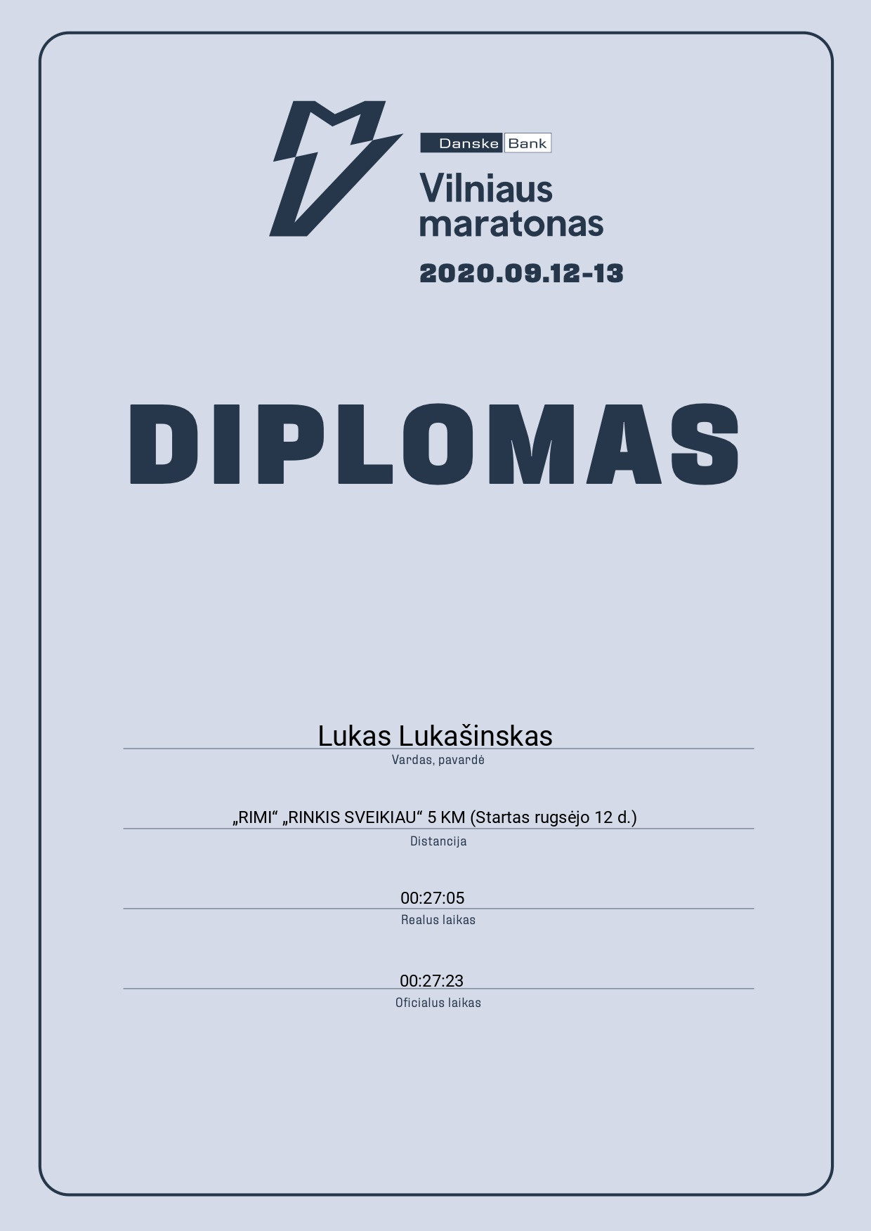 297 Donatas Kudžma 30598 Lithuania „RIMI“ „RINKIS SVEIKIAU“ 5 KM (Startas rugsėjo 12 d.) 00:27:22 00:26:44 Diplomas
