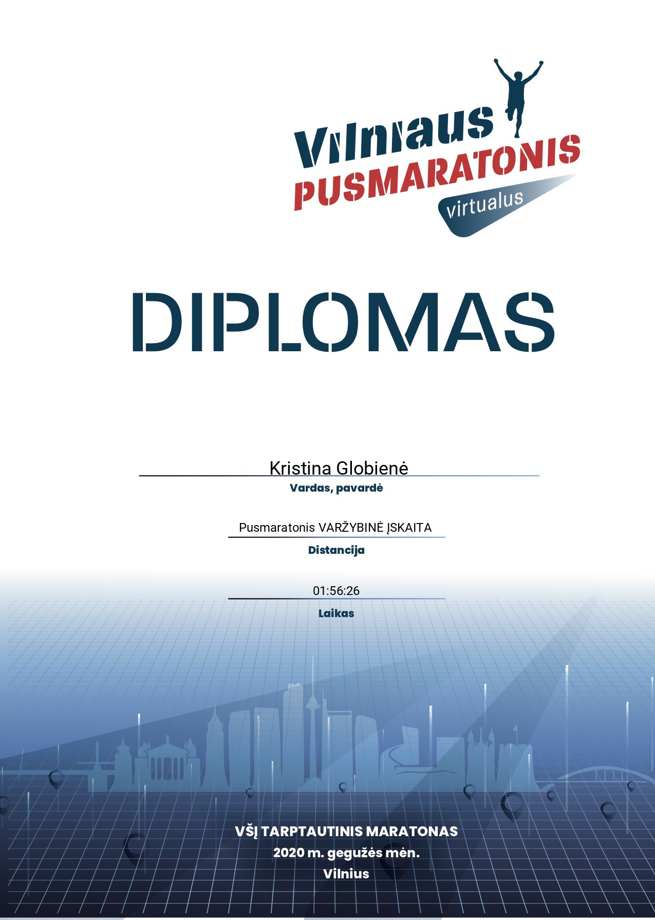 106 Kristina Globienė Manodaktaras.lt 224 Lithuania Pusmaratonis VARŽYBINĖ ĮSKAITA 01:56:26 Diplomas