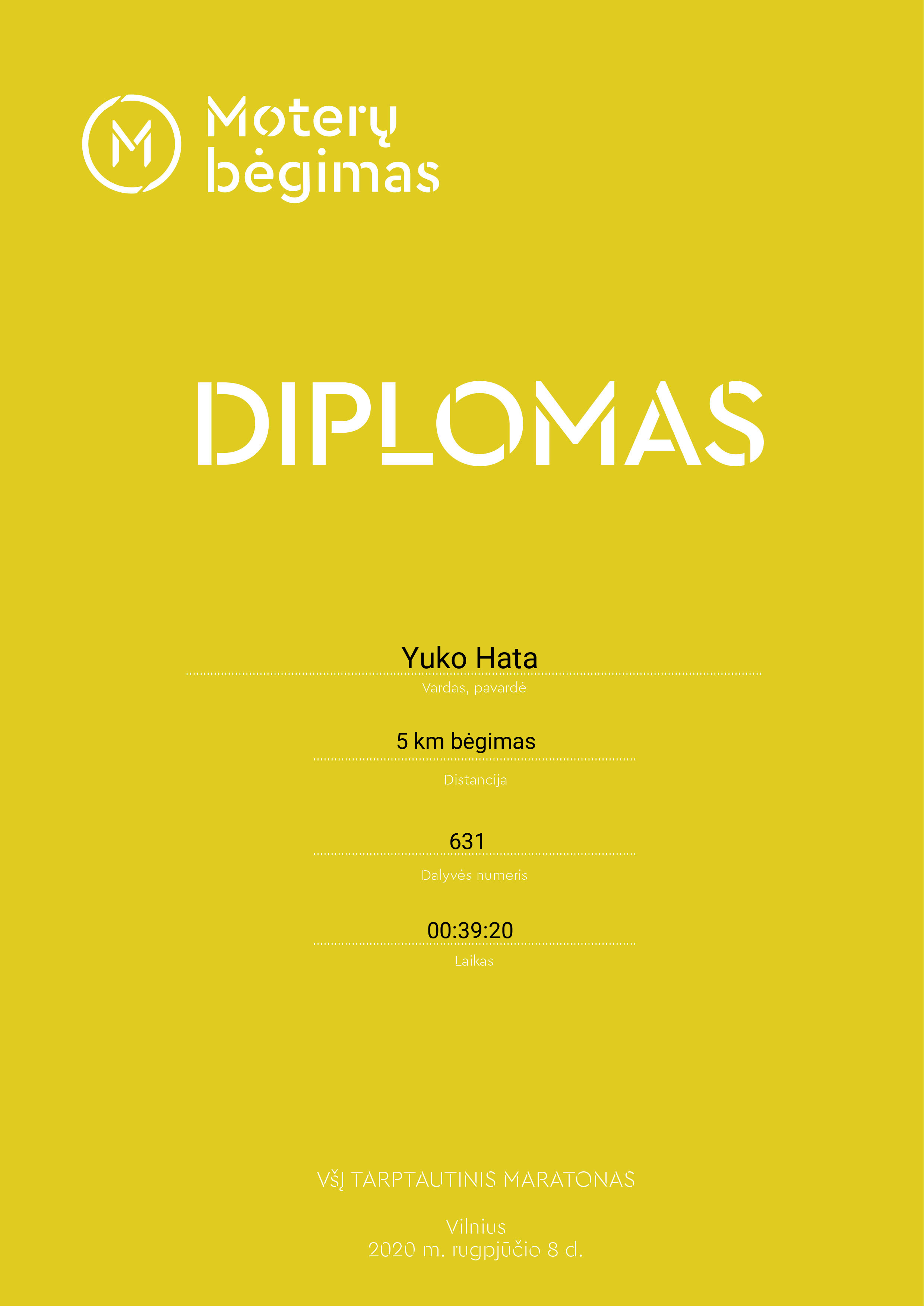 | 473 | Yuko Hata | 631 | Japan | 5 km bėgimas | 00:39:20 | Diplomas | |