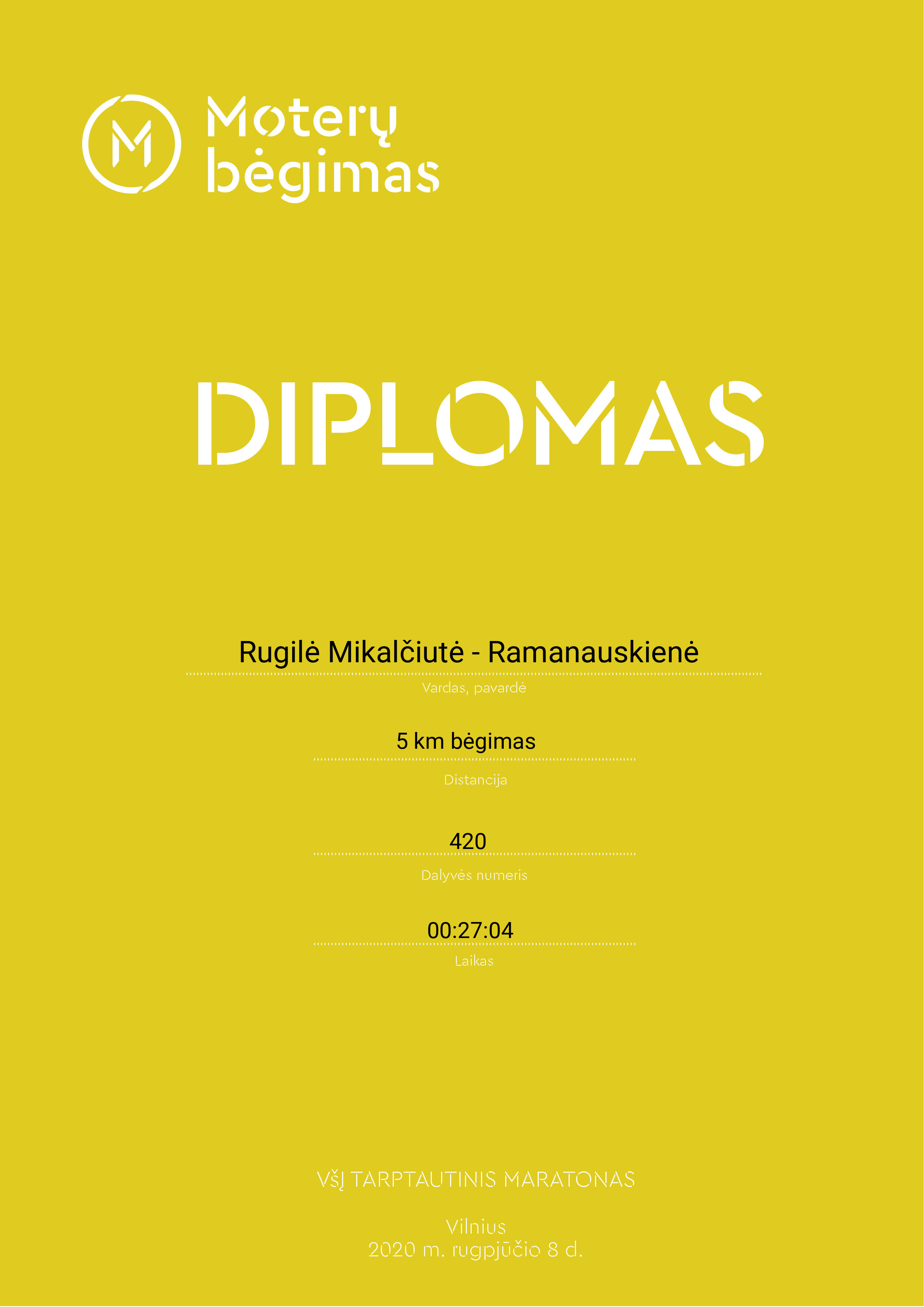 | 106 | Rugilė Mikalčiutė - Ramanauskienė | 420 | Lithuania | 5 km bėgimas | 00:27:04 | Diplomas | |