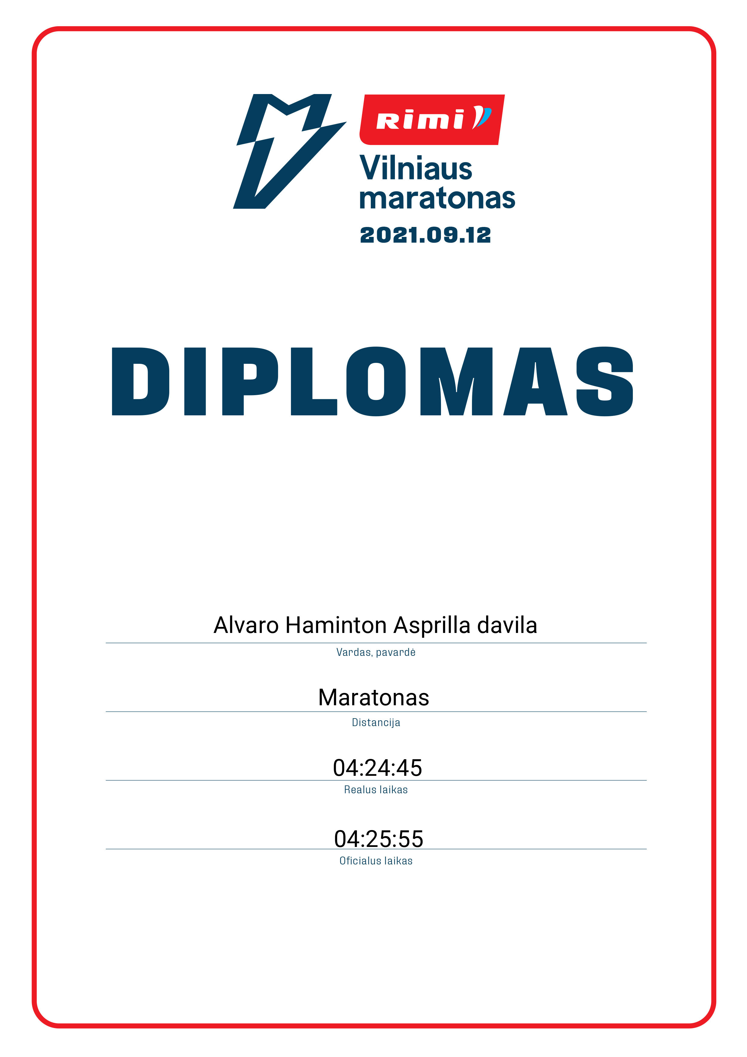 | 445 | Alvaro Haminton Asprilla davila | 910 | Lithuania | Maratonas | 04:25:55 | Diplomas | |