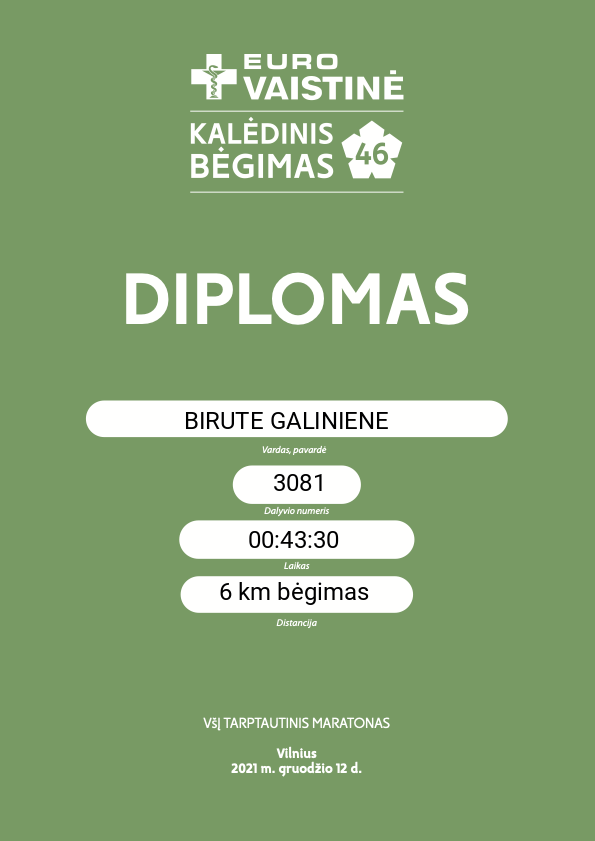 | 376 | BIRUTE GALINIENE | Vilnius BMK INŽINERIJA | 3081 | Lithuania | 6 km bėgimas | 00:43:36 | Diplomas |