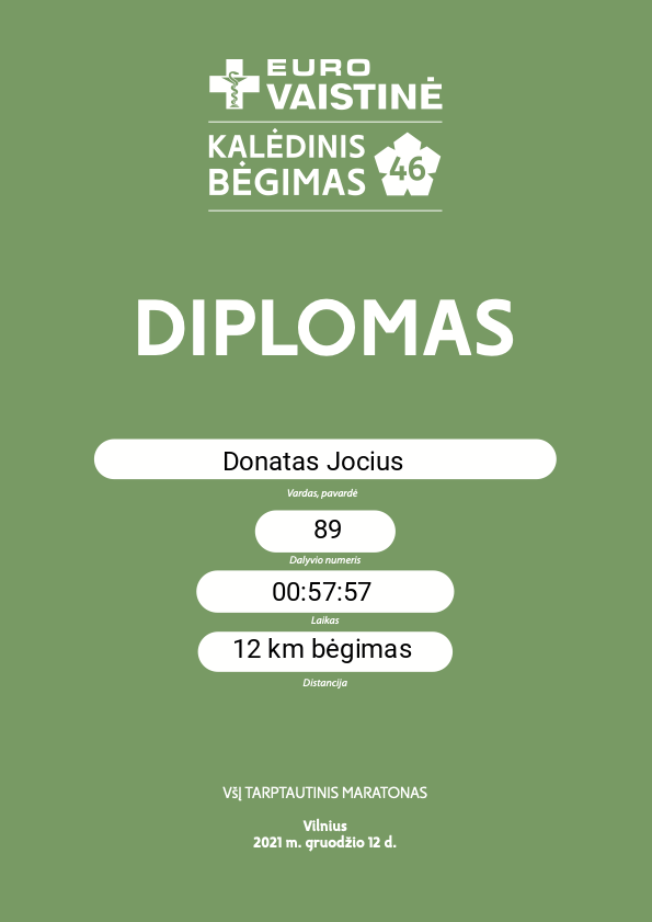 | 5 | Ana Mišarina | 10004 | Lithuania | VIRTUALUS 12 km bėgimas | 01:49:45 | Diplomas | |