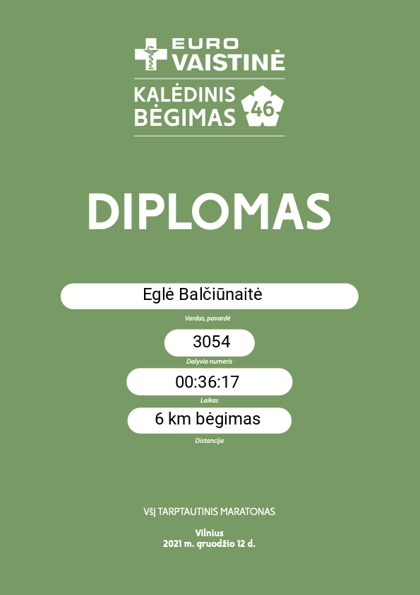 | 215 | Eglė Balčiūnaitė | 3054 | Lithuania | 6 km bėgimas | 00:36:53 | Diplomas | |