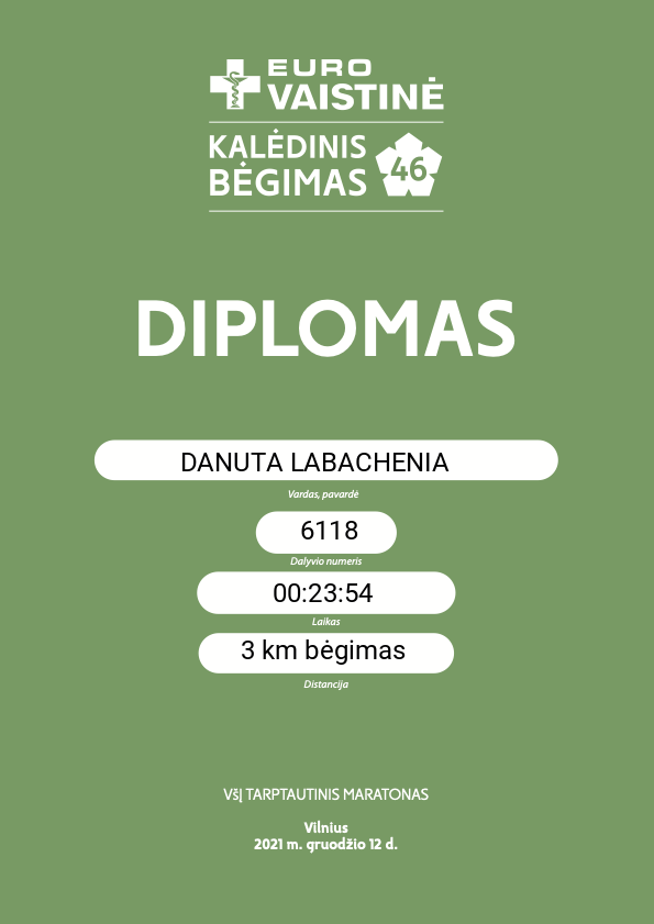 | 252 | DANUTA LABACHENIA | CAPTURED | 6118 | Lithuania | 3 km bėgimas | 00:24:08 | Diplomas |