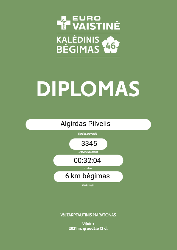 | 107 | Algirdas Pilvelis | Vilniaus miesto klinikinės ligoninės komanda | 3345 | Lithuania | 6 km bėgimas | 00:32:48 | Diplomas |