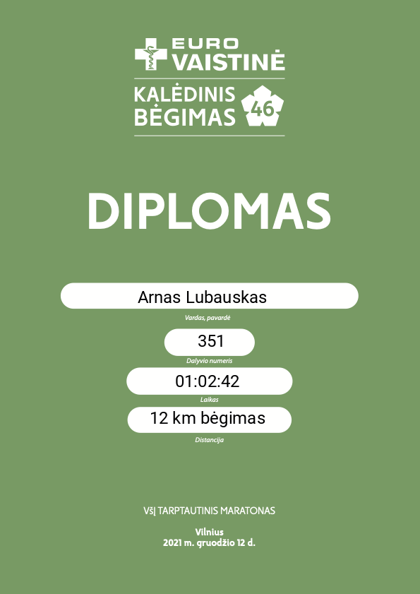 | 132 | Arnas Jackūnas | Go Vilnius | 216 | Lithuania | 12 km bėgimas | 00:59:05 | Diplomas |
