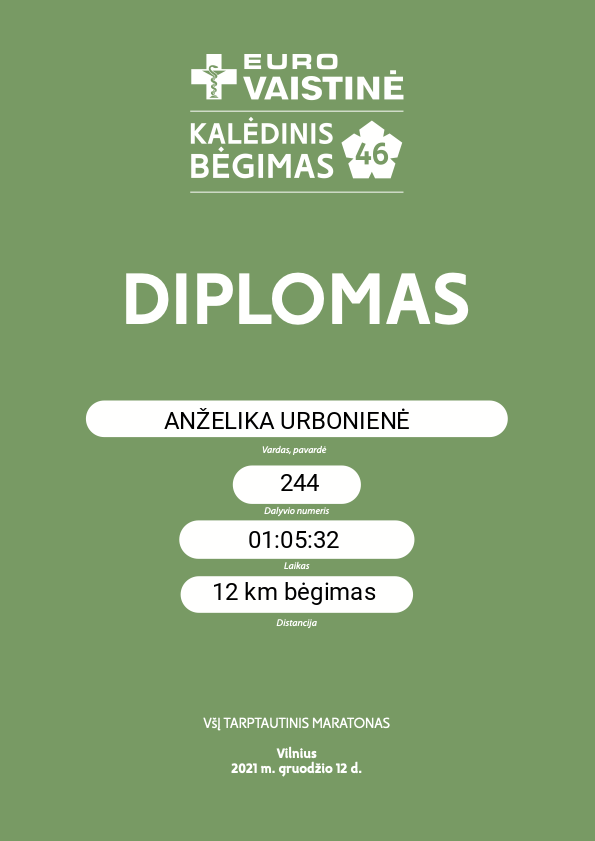 | 246 | ANŽELIKA URBONIENĖ | 244 | Lithuania | 12 km bėgimas | 01:05:49 | Diplomas | |