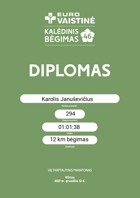 | 360 | Rokas Zaleckis | Love Streams Running | 293 | Lithuania | 12 km bėgimas | 01:11:25 | Diplomas |
