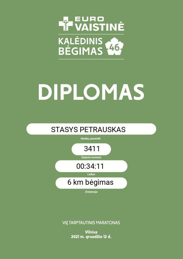 160 STASYS PETRAUSKAS nera 3411 Lithuania 6 km bėgimas 00:34:24 00:34:11 00:16:29 Diplomas