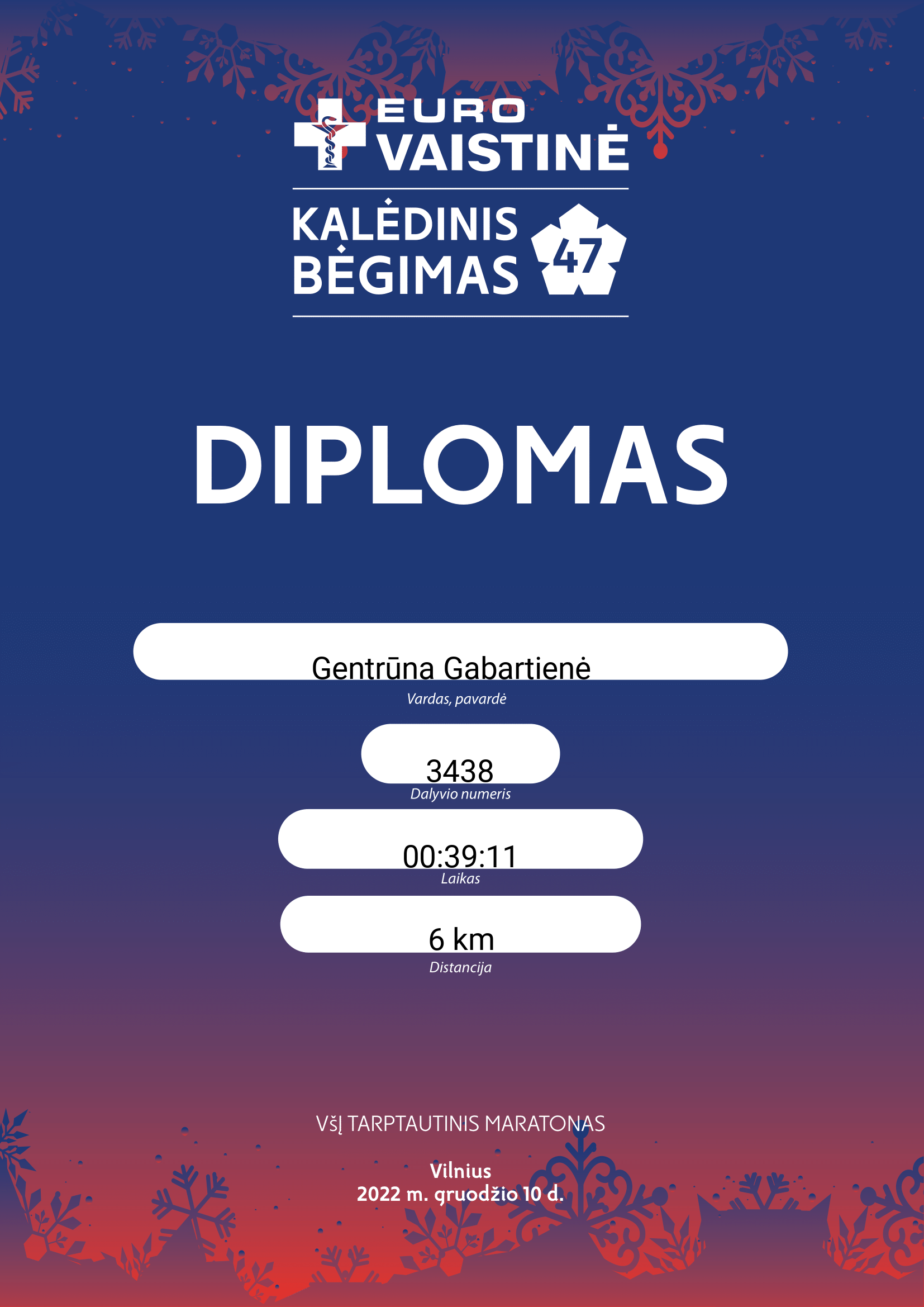 | 398 | Gentrūna Gabartienė | VŠT | 3438 | Lithuania | 6 km | 00:39:11 | Diplomas |
