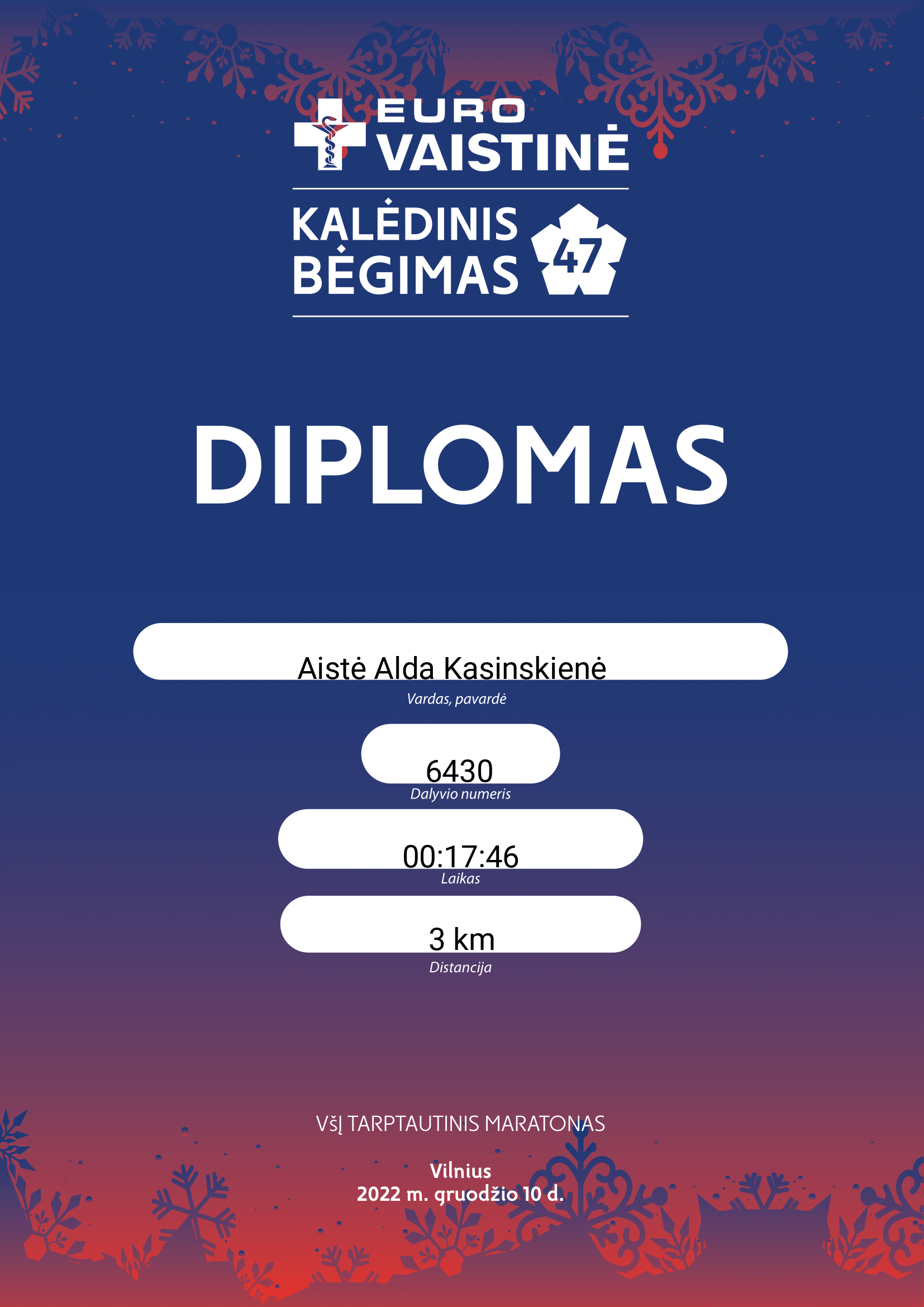 | 81 | Aistė Alda Kasinskienė | TRItonas | 6430 | Lithuania | 3 km | 00:17:46 | Diplomas |
