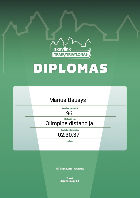 | 72 | Mindaugas Rudys | CIRKO MEŠKUTĘS | 77 | Lithuania | Olimpinė distancija | 02:39:24 | Diplomas |