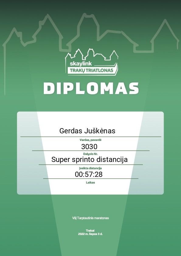 | 28 | Gediminas Toleikis | Klaipėdos triatlono klubas | 3026 | Lithuania | Super sprinto distancija | 00:44:49 | Diplomas |