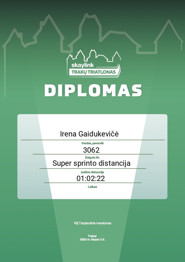 | 10 | Julija Kairaitytė | Ironmama | 5017 | Lithuania | Estafetė: Sprinto distancija | 01:26:55 | Diplomas |