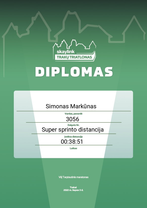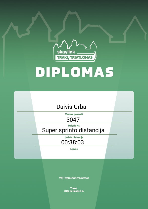 | 13 | Daivis Urba | Kauno Triatlono Klubas | 3047 | Lithuania | Super sprinto distancija | 00:38:03 | Diplomas |