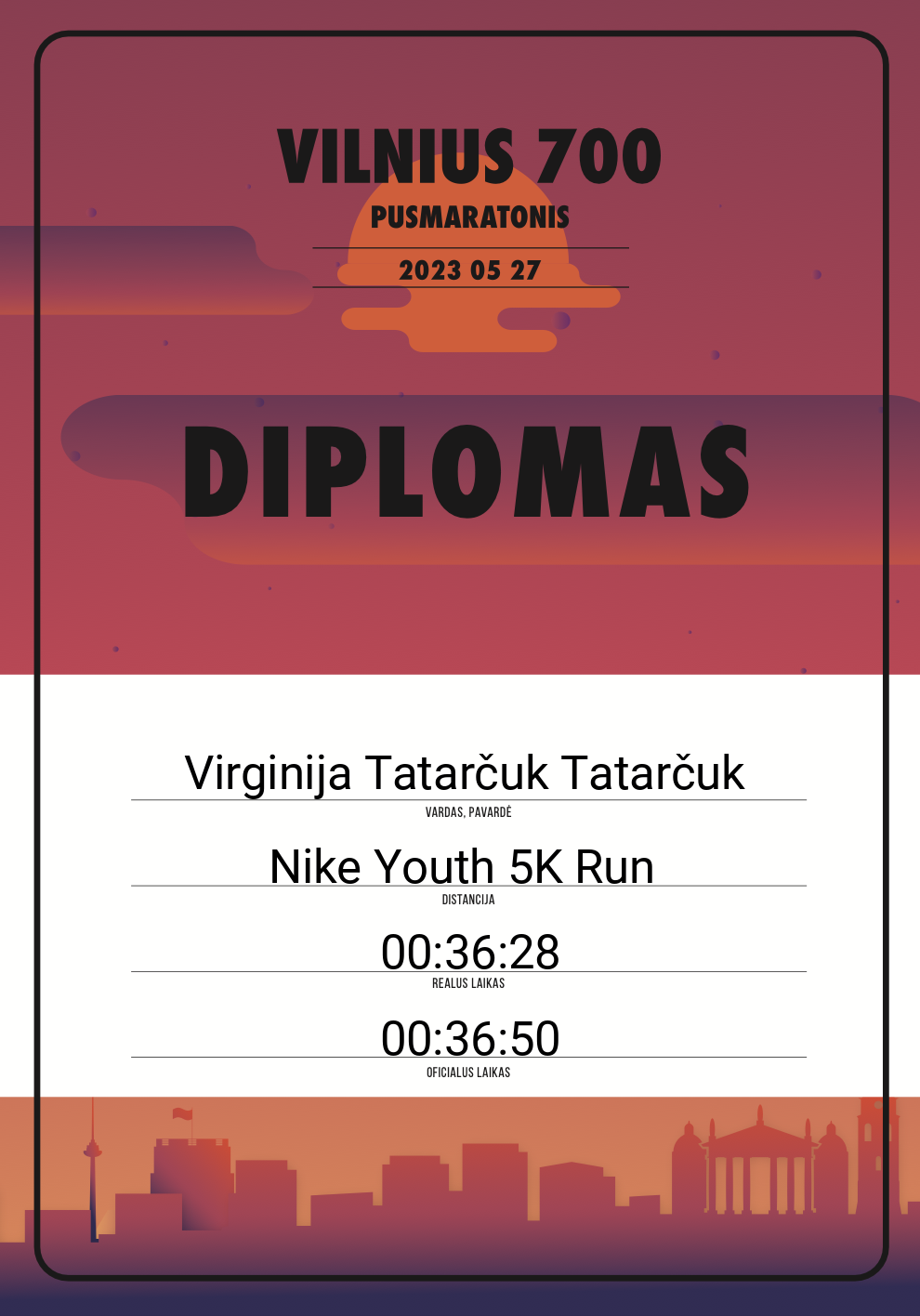 | 418 | Virginija Tatarčuk Tatarčuk | 30572 | Lithuania | Nike Youth 5K Run | 00:36:50 | Diplomas | |