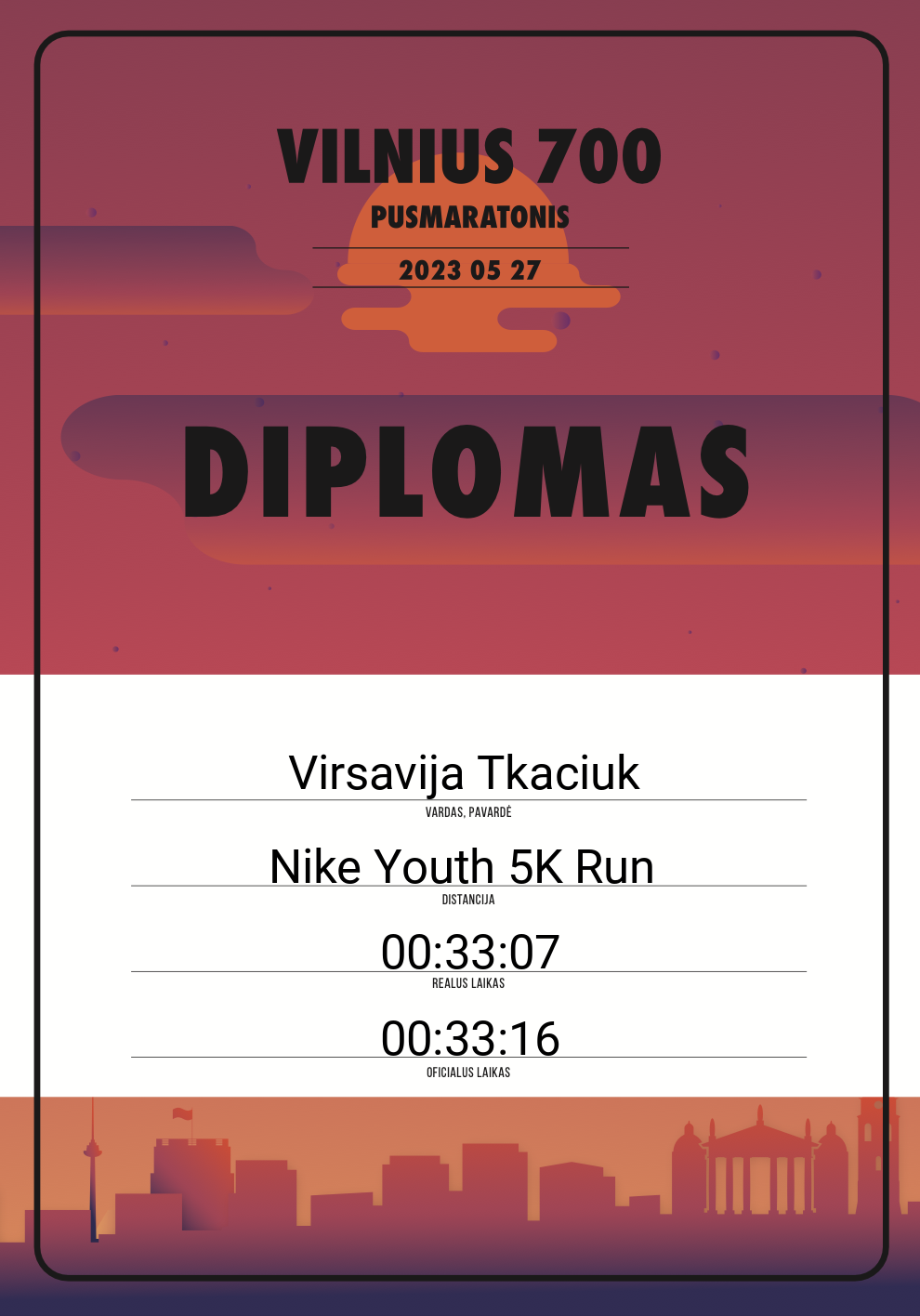 | 348 | Virsavija Tkaciuk | Sostinės sporto centras | 30416 | Lithuania | Nike Youth 5K Run | 00:33:16 | Diplomas |