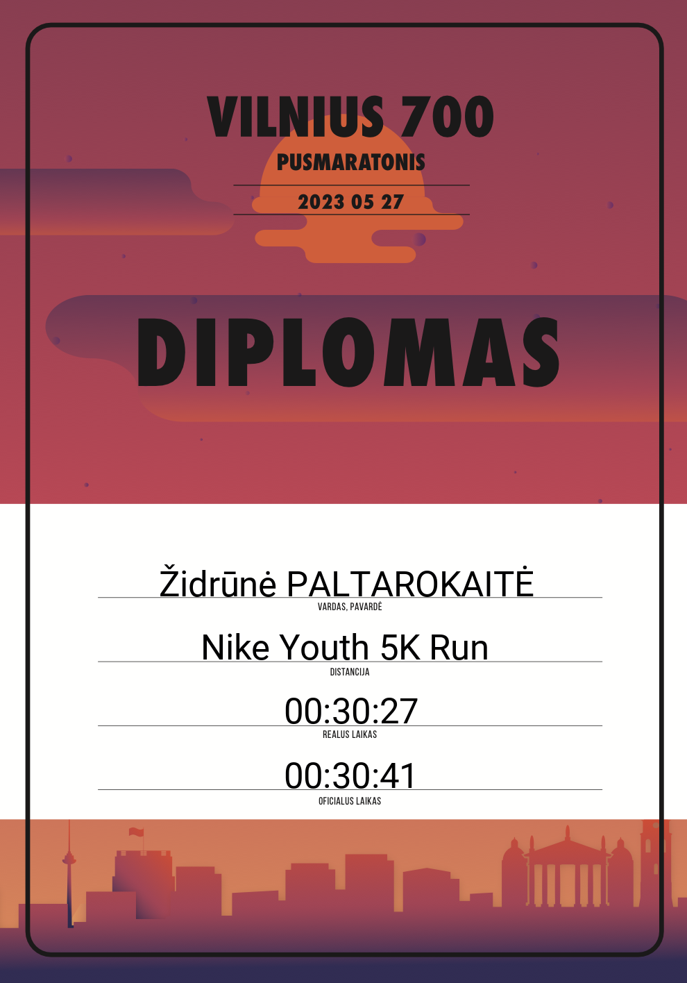 | 261 | Židrūnė PALTAROKAITĖ | 30251 | Lithuania | Nike Youth 5K Run | 00:30:41 | Diplomas |