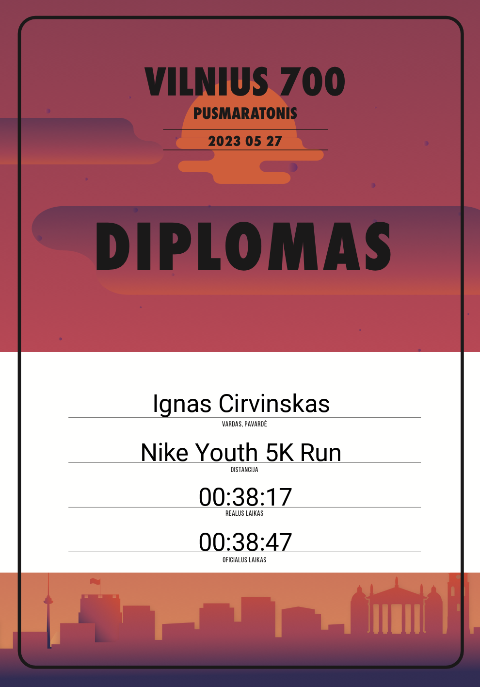 | 430 | Ignas Cirvinskas | 30253 | Lithuania | Nike Youth 5K Run | 00:38:47 | Diplomas | |