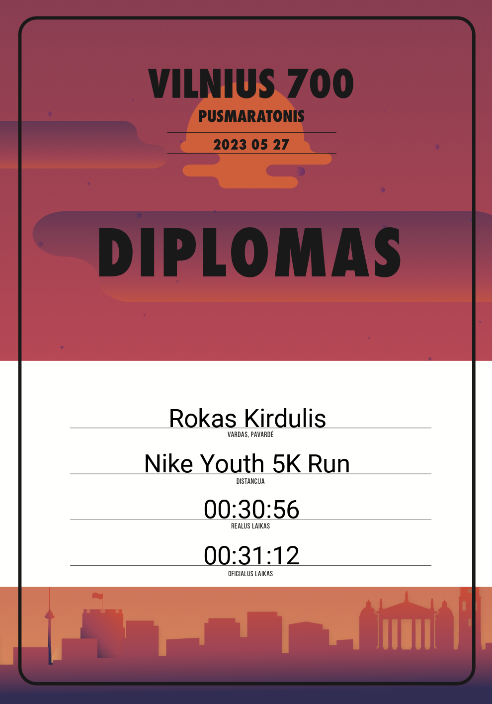 | 286 | Rokas Kirdulis | Lituanica X | 30255 | Lithuania | Nike Youth 5K Run | 00:31:12 | Diplomas |