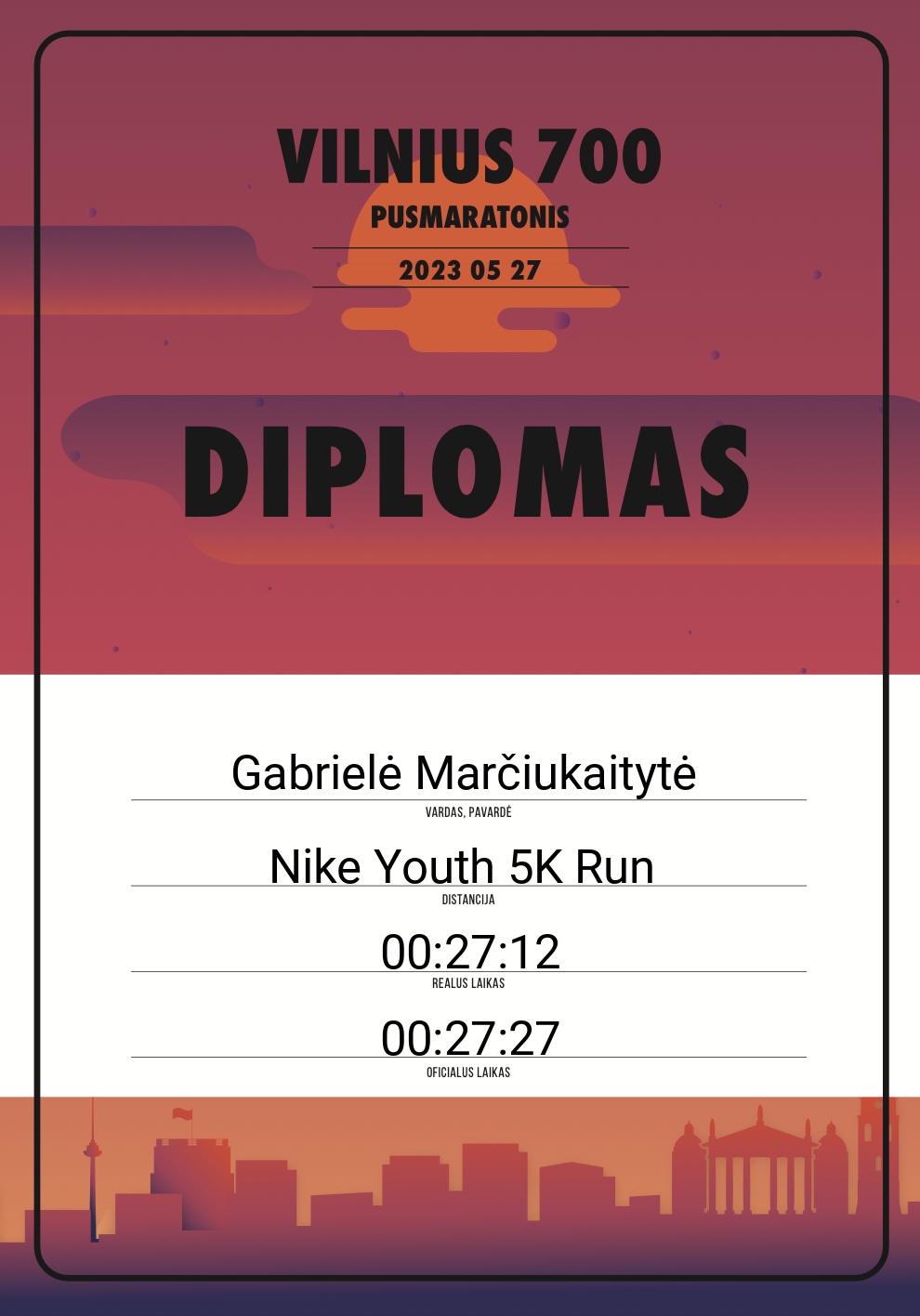 | 159 | Gabrielė Marčiukaitytė | 30270 | Lithuania | Nike Youth 5K Run | 00:27:27 | Diplomas |