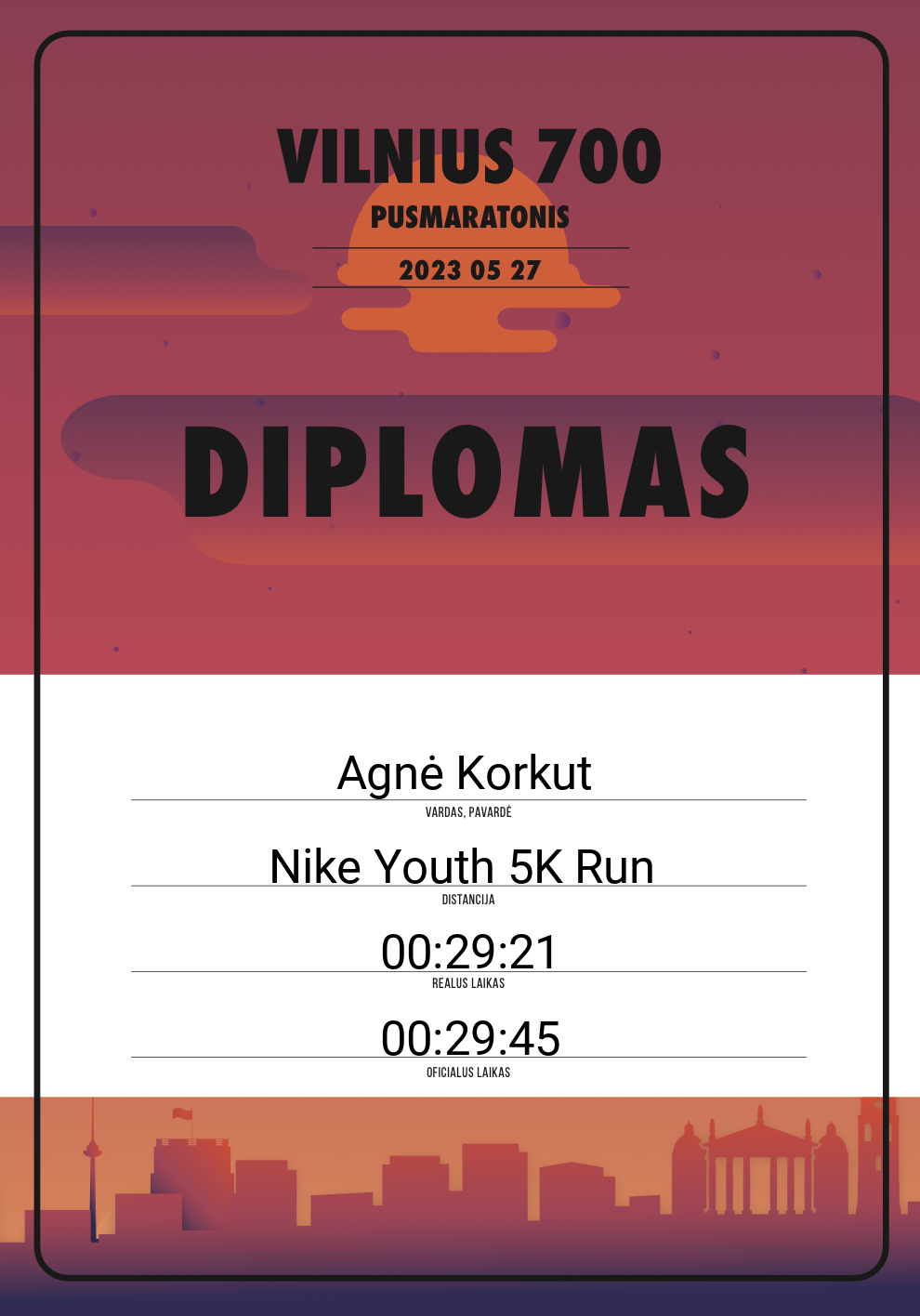 | 229 | Agnė Korkut | 30272 | Lithuania | Nike Youth 5K Run | 00:29:45 | Diplomas | |