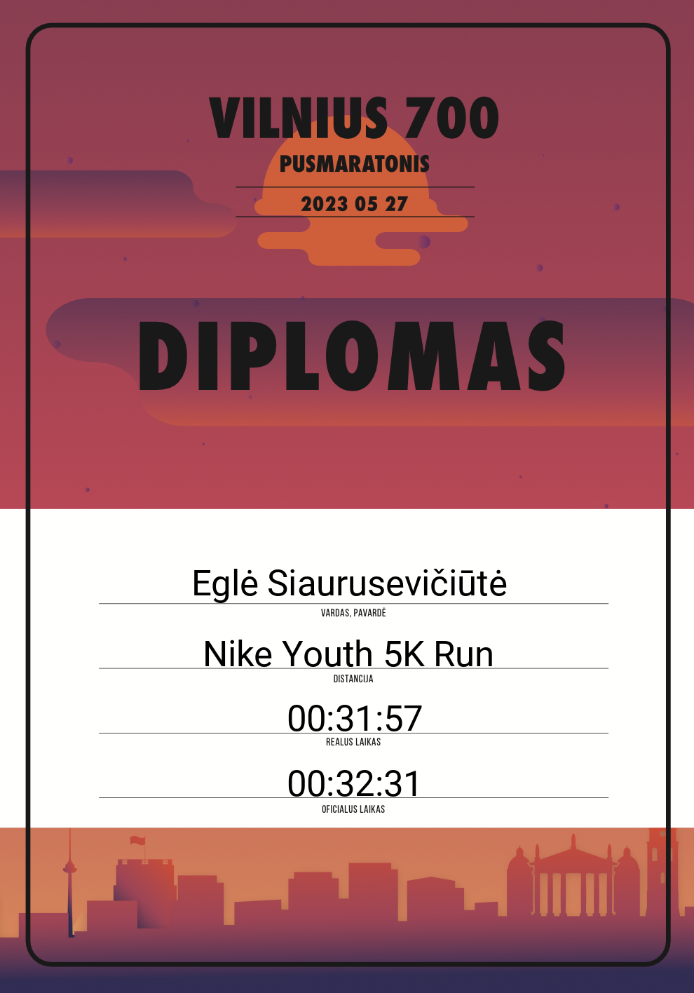 | 330 | Eglė Siaurusevičiūtė | Biržiška bėga | 30306 | Lithuania | Nike Youth 5K Run | 00:32:31 | Diplomas |