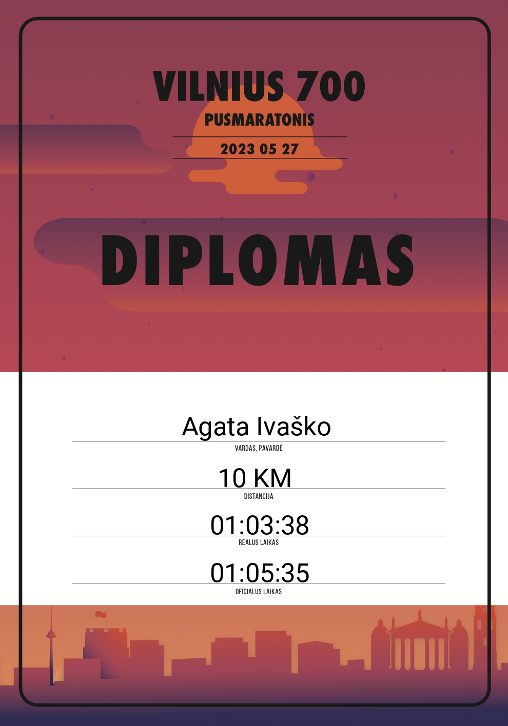 700 Agata Ivaško 20301 Lithuania 10 KM 01:05:35 01:03:38 00:33:18 Diplomas