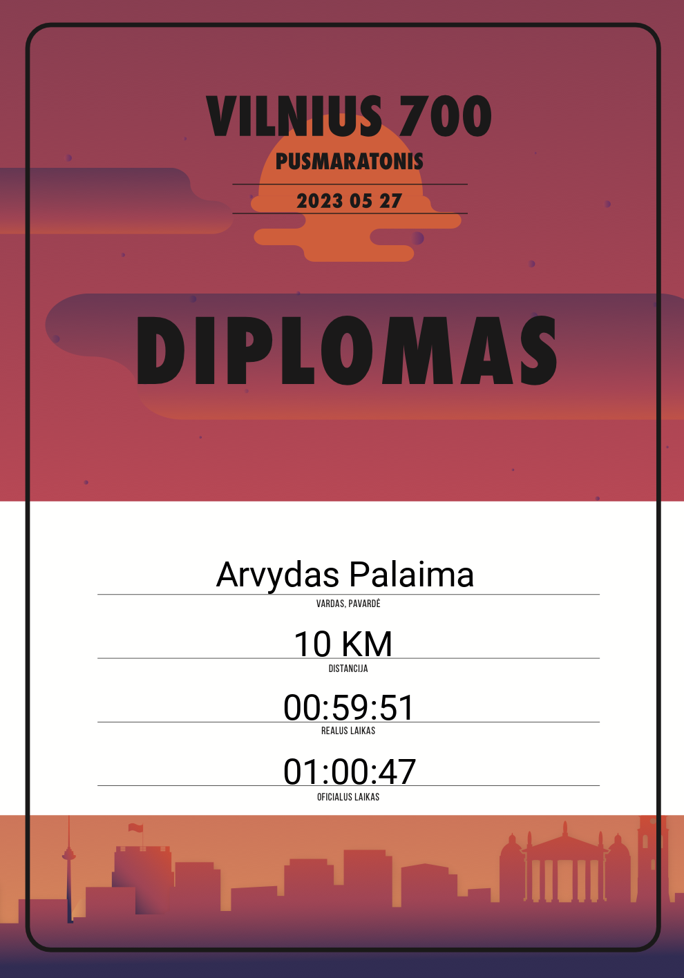 | 617 | Arvydas Osipovas | 10378 | Lithuania | 21,098 KM | 02:03:20 | Diplomas | |