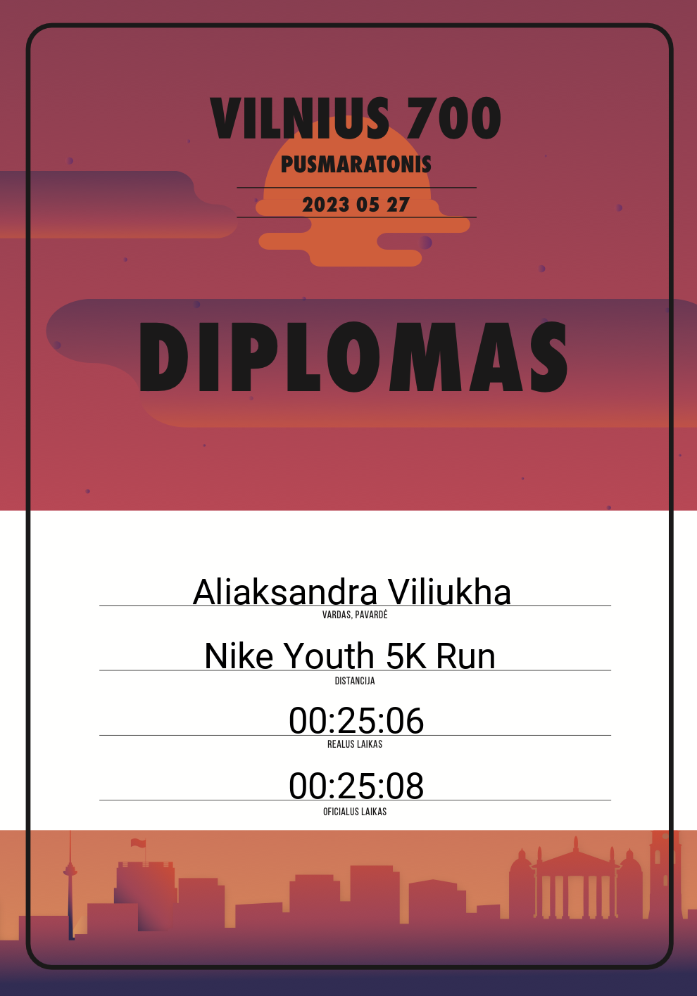 | 95 | Aliaksandra Viliukha | Runstudio | 30544 | Lithuania | Nike Youth 5K Run | 00:25:08 | Diplomas |
