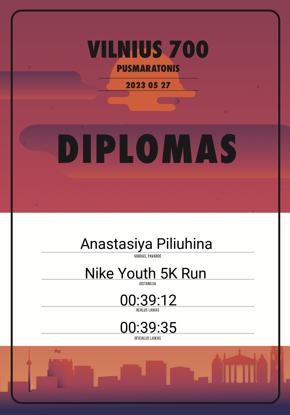 | 432 | Anastasiya Piliuhina | 30330 | Lithuania | Nike Youth 5K Run | 00:39:35 | Diplomas | |