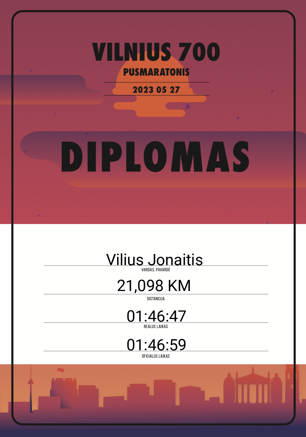 | 521 | GEDIMINAS DRUSKIS | Fat Jesus Running club | 10719 | Lithuania | 21,098 KM | 01:57:38 | Diplomas |
