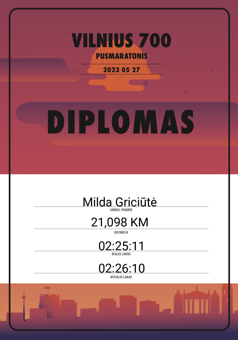 | 839 | Milda Griciūtė | 10835 | Lithuania | 21,098 KM | 02:26:10 | Diplomas | |