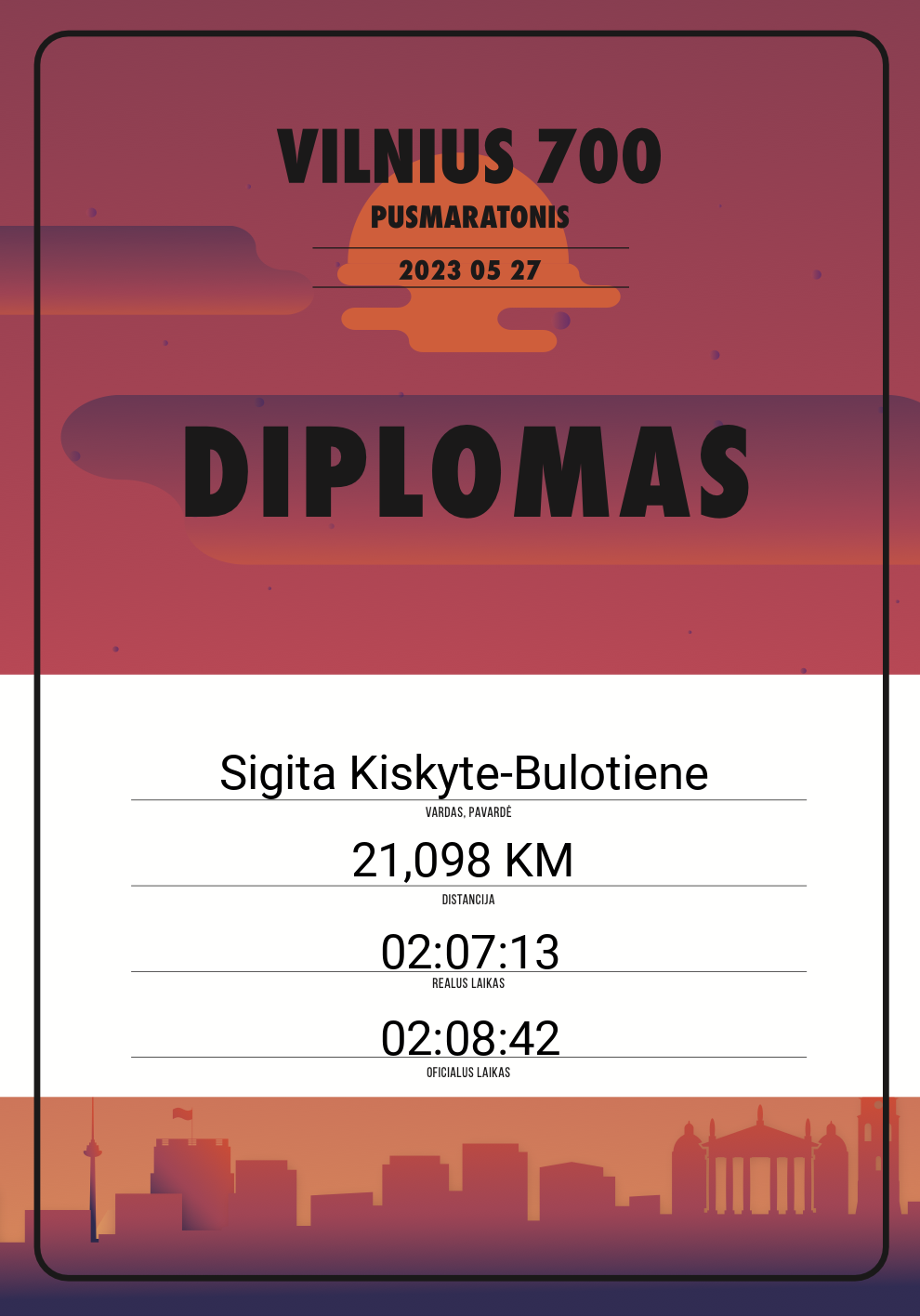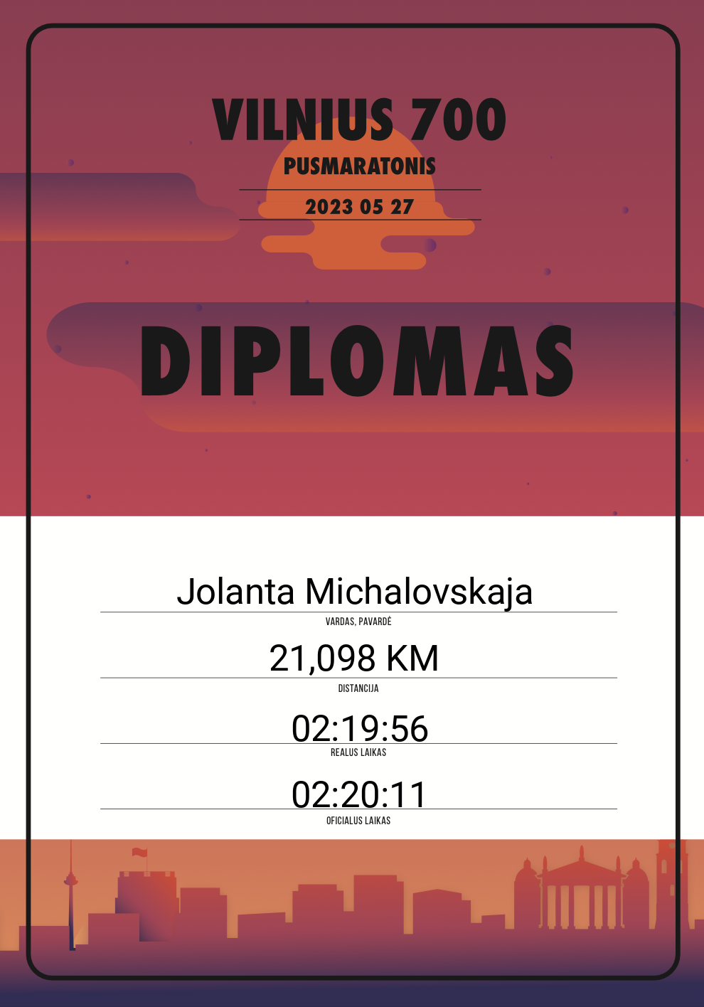 | 752 | Miglė Dirmeitienė | Sesės bėga | 10940 | Lithuania | 21,098 KM | 02:14:49 | Diplomas |