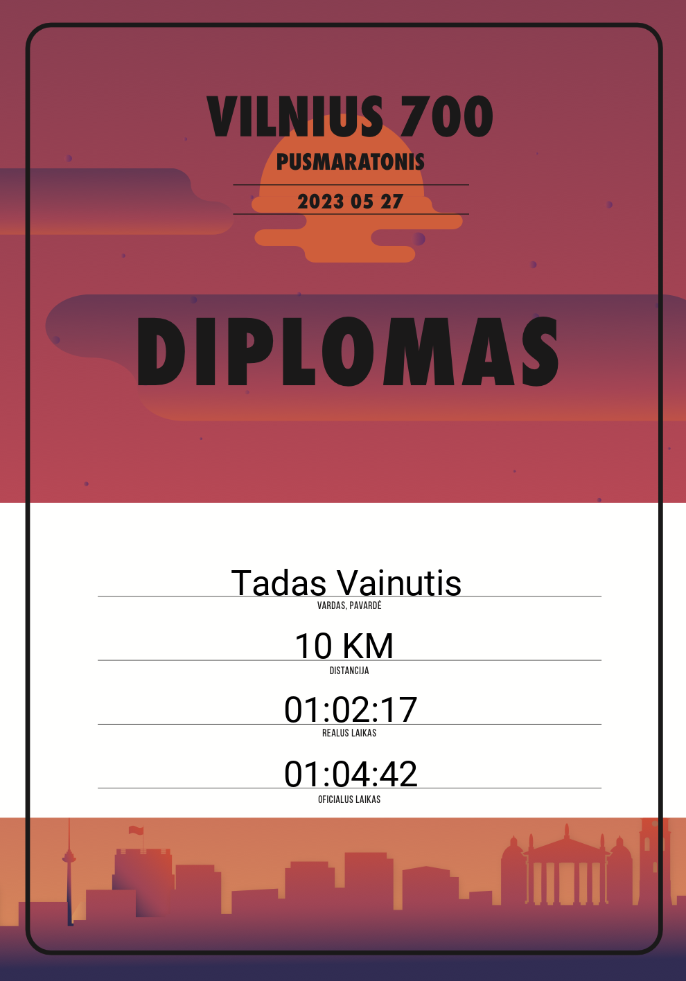| 800 | Povilas Dudlauskas | 20365 | Lithuania | 10 KM | 01:10:07 | Diplomas | |