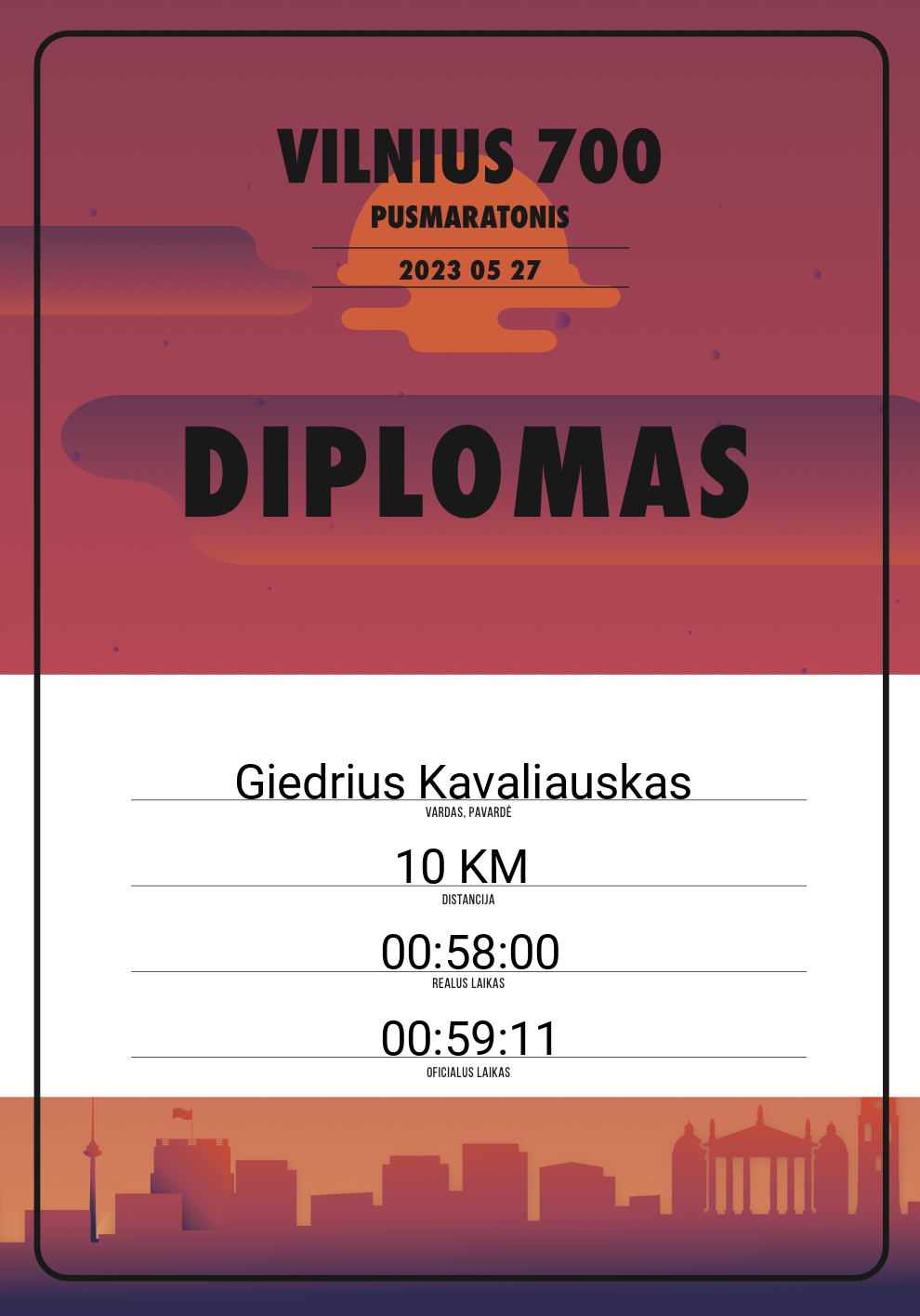 | 397 | Danas Tilvikas | 20185 | Lithuania | 10 KM | 00:56:49 | Diplomas | |