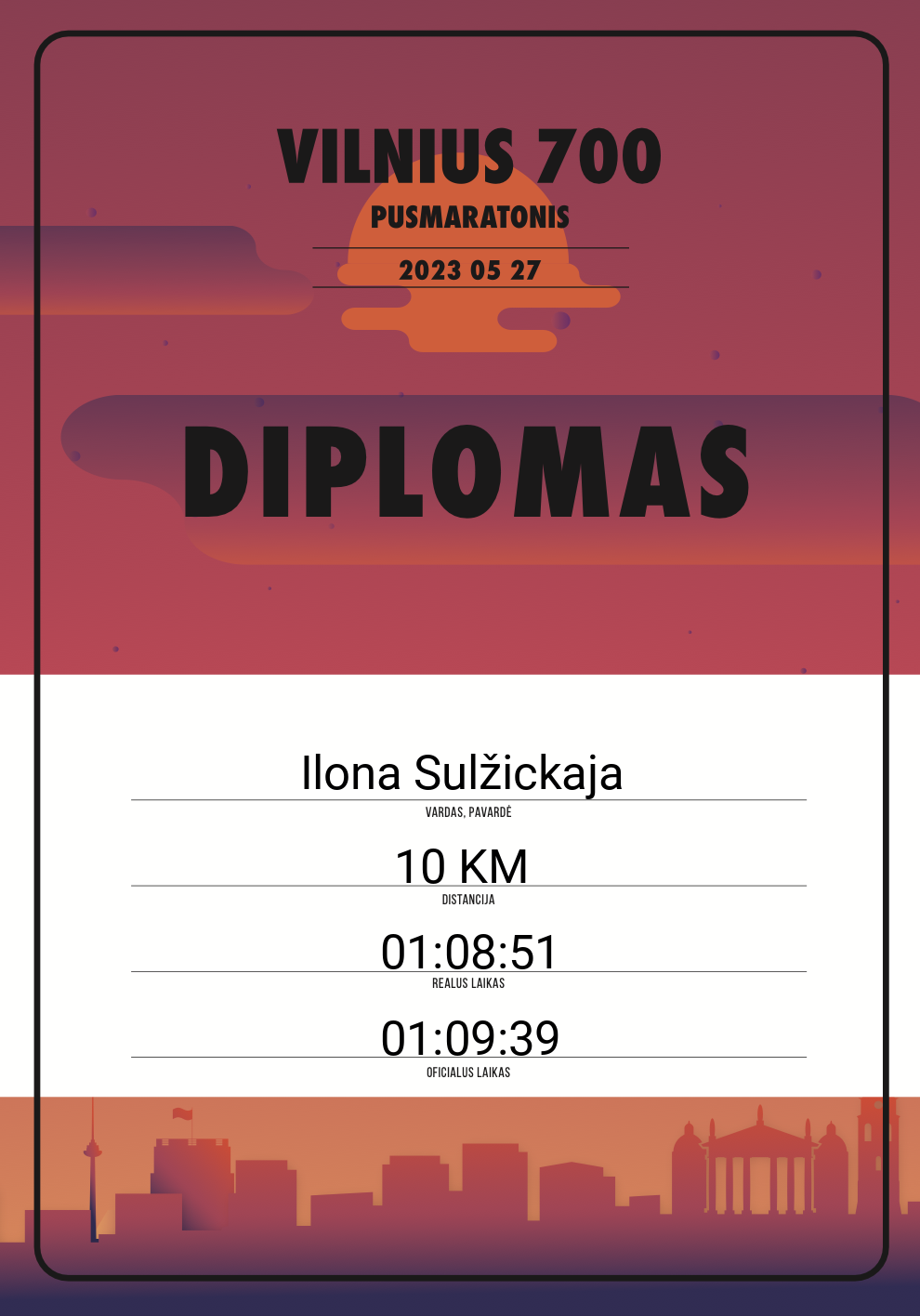 | 719 | Kasparas Kregždė | 20838 | Lithuania | 10 KM | 01:06:09 | Diplomas | |