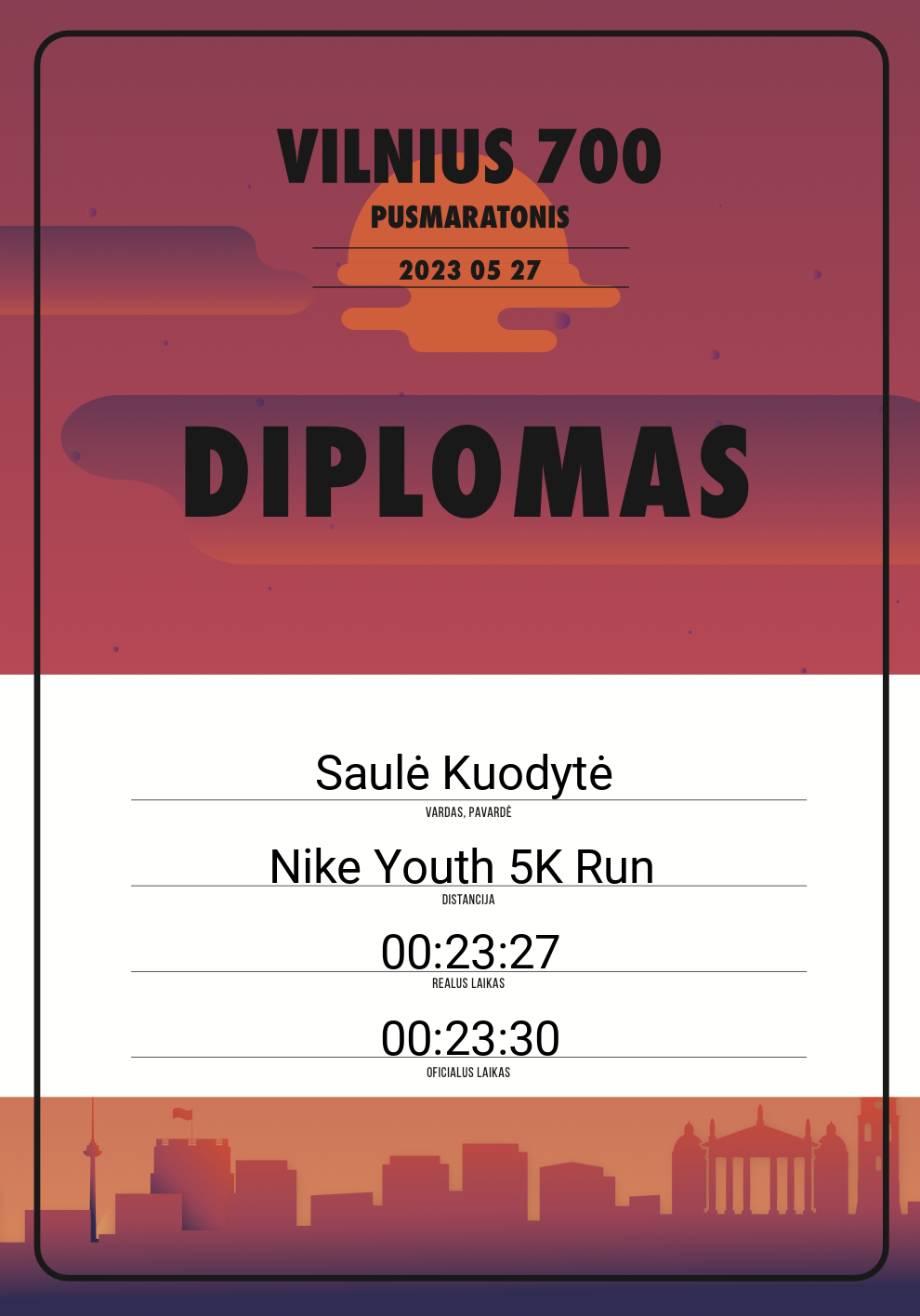 | 62 | Saulė Kuodytė | Sostinės sporto centras | 30386 | Lithuania | Nike Youth 5K Run | 00:23:30 | Diplomas |