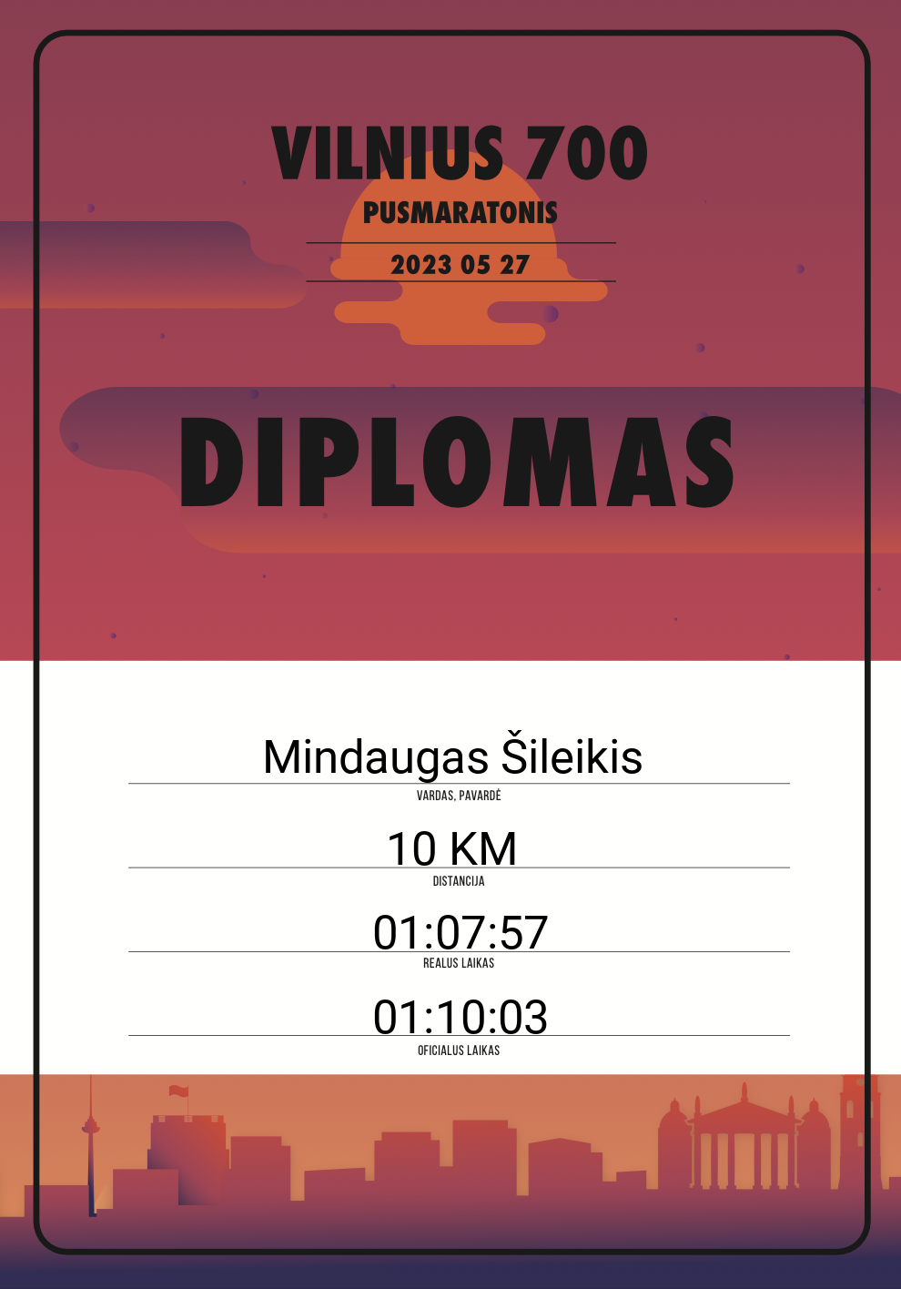 800 Povilas Dudlauskas 20365 Lithuania 10 KM 01:10:07 01:07:55 00:37:04 Diplomas