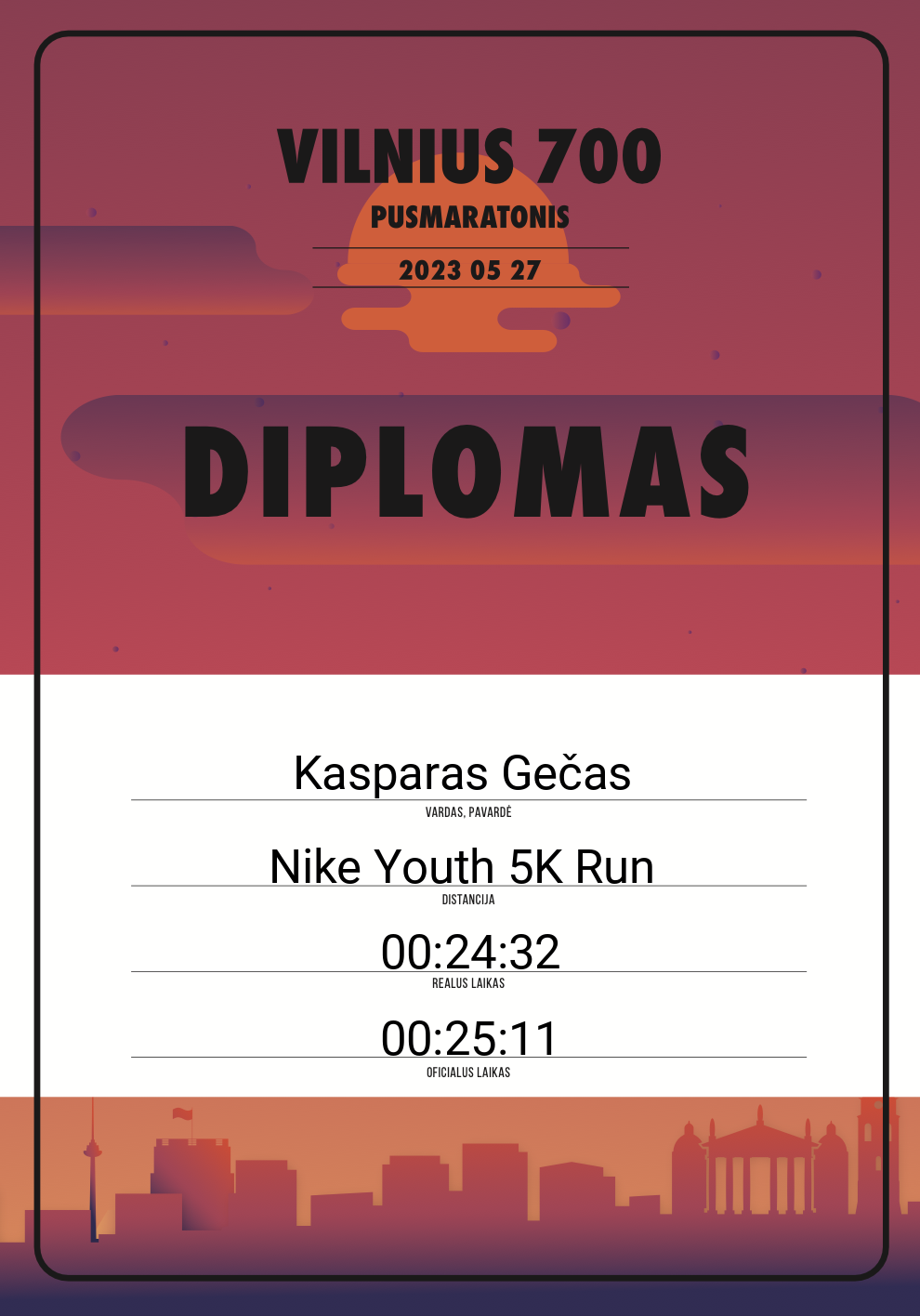 | 97 | Kasparas Gečas | 30624 | Lithuania | Nike Youth 5K Run | 00:25:11 | Diplomas | |
