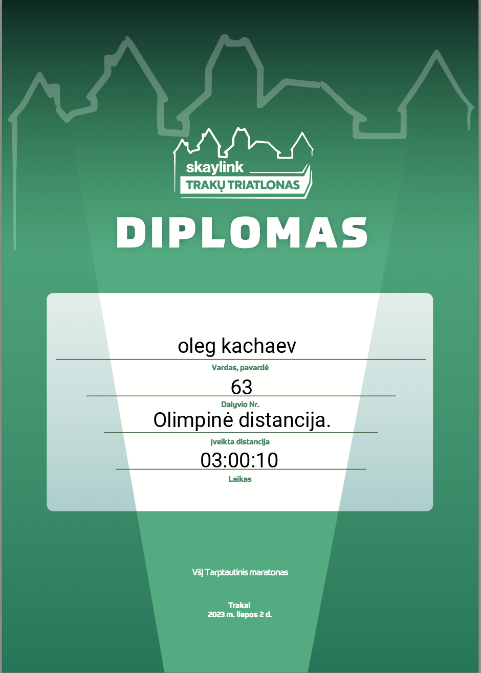 | 155 | oleg kachaev | 63 | Lithuania | Olimpinė distancija. | 03:00:10 | Diplomas | |