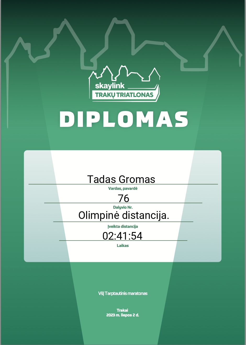 | 100 | Tadas Gromas | zoomies | 76 | Lithuania | Olimpinė distancija. | 02:41:54 | Diplomas |