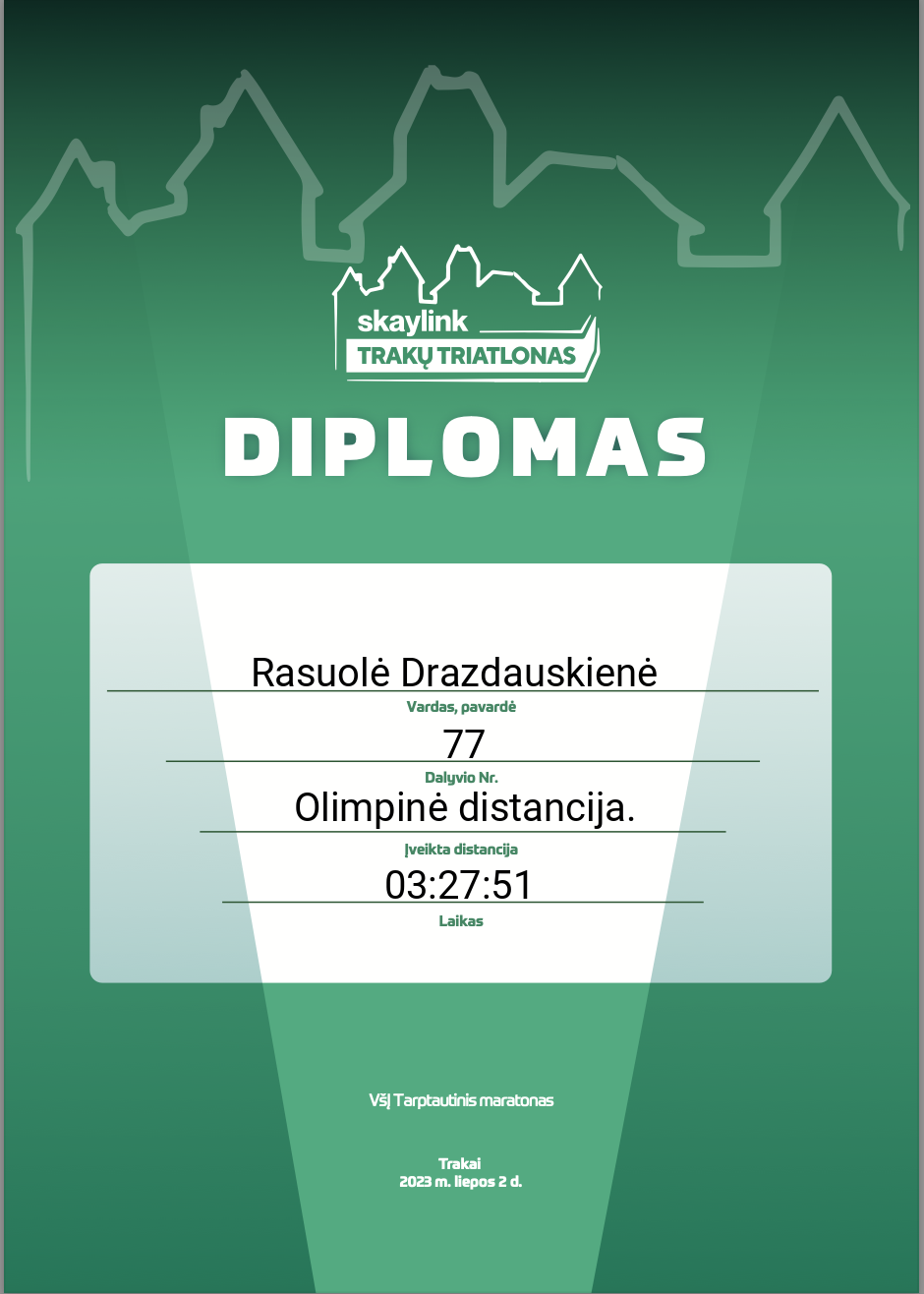 | 82 | Greta Urbutytė | Trakų Triatlono Būrelis | 79 | Lithuania | Olimpinė distancija. | 02:36:34 | Diplomas |