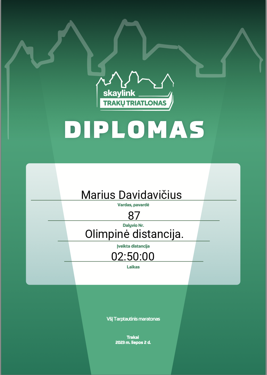 | 171 | Titas Tičkūnas | VUŽK | 85 | Lithuania | Olimpinė distancija. | 03:05:44 | Diplomas |