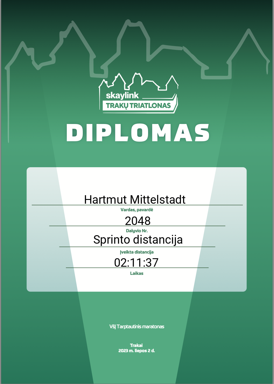 | 15 | Tomas Bizimavičius | Kauno Triatlono Klubas | 2043 | Lithuania | Sprinto distancija | 01:12:49 | Diplomas |
