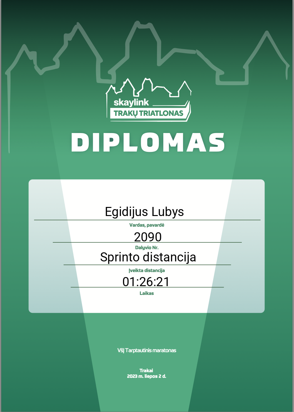 | 89 | Egidijus Lubys | Klaipėdos Triatlono Klubas | 2090 | Lithuania | Sprinto distancija | 01:26:21 | Diplomas |