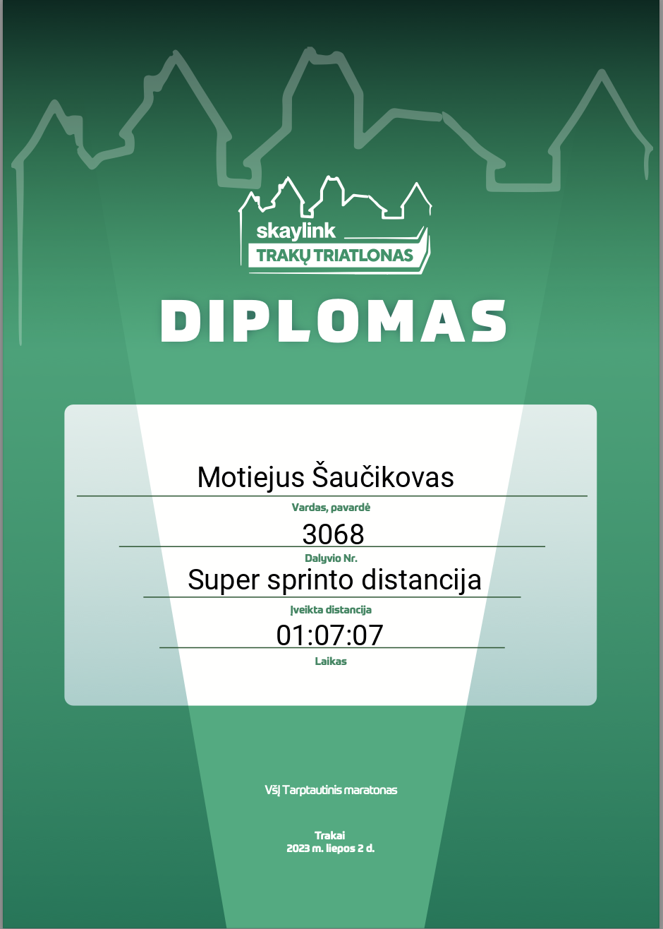 | 57 | Motiejus Šaučikovas | Sostinės SC | 3068 | Lithuania | Super sprinto distancija | 01:07:07 | Diplomas |
