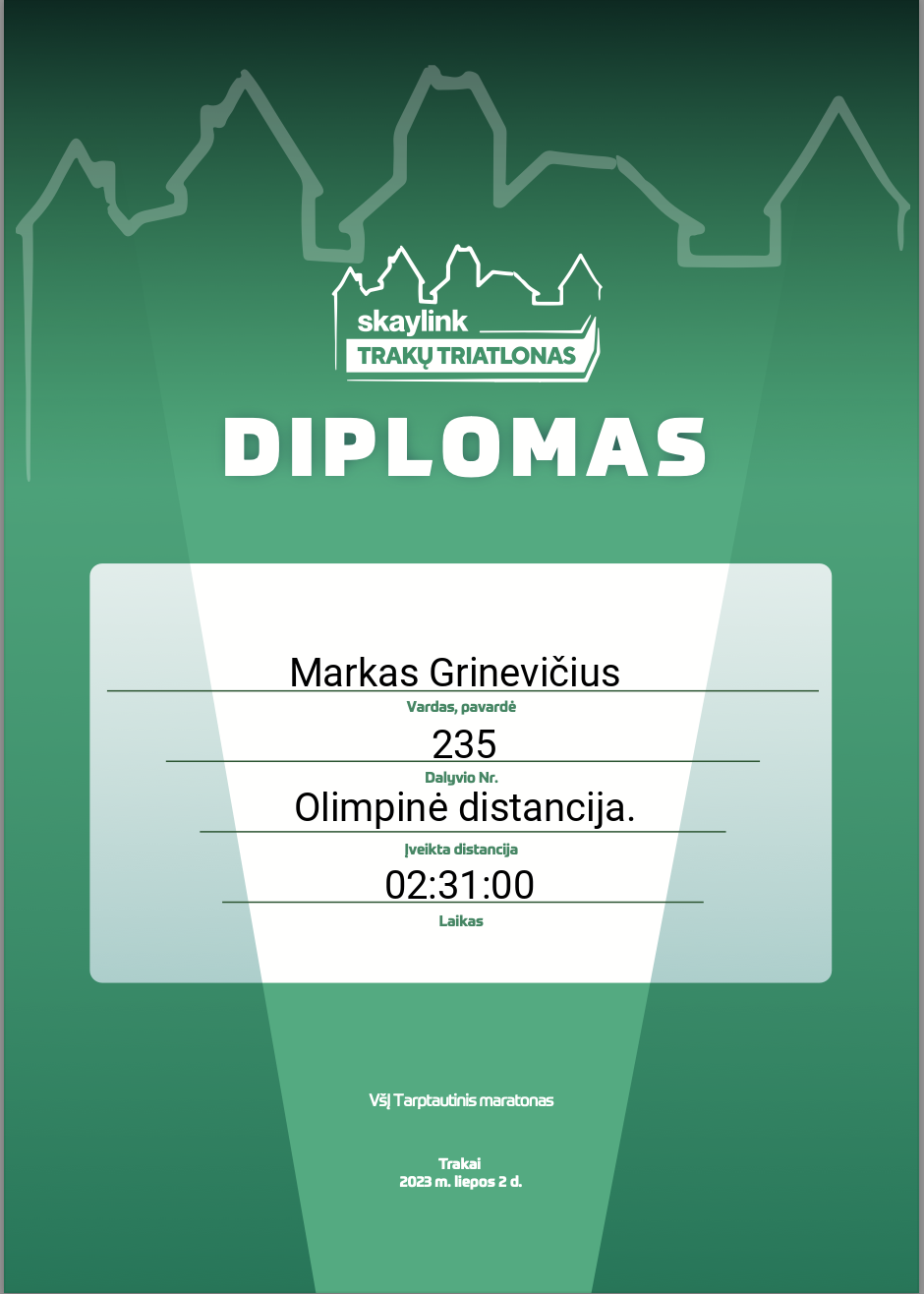 | 61 | Markas Grinevičius | Milllion Steps | 235 | Lithuania | Olimpinė distancija. | 02:31:00 | Diplomas |